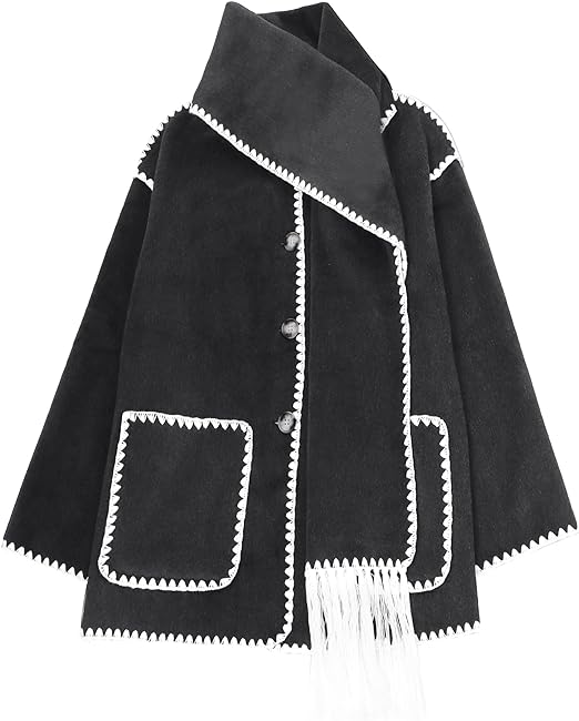 SeekMe Womens Embroidered Scarf Jacket Oversized Wool Blend Coat Button Down Winter Outerwear with Tassel Scarf
