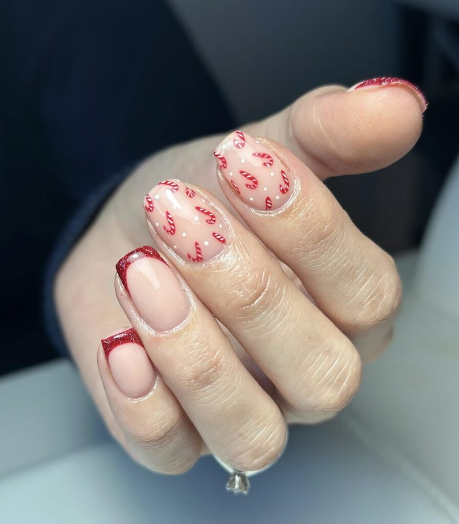 The addition of accent nails featuring cute candy cane designs adds a playful, festive twist to the otherwise elegant French manicure. It’s the perfect combination of chic and cheerful, making it a standout holiday manicure that is both trendy and festive.