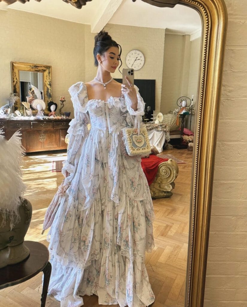 The aesthetic of the Regency era is very romantic and soft. it consisted of pastel colors, square necklines, puff sleeves, empire waistlines, and fancy floral prints. and an added touch of elegance with romantic details like ruffles, lace, and embroidery.