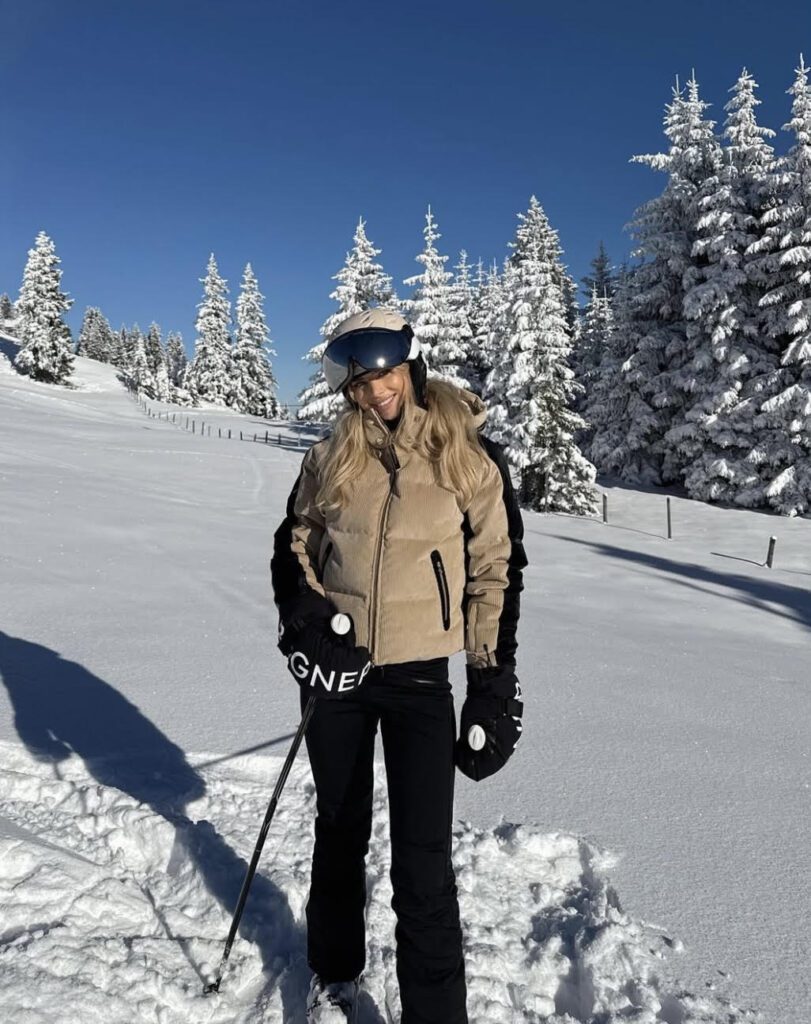 A monochrome look always looks put together and chic without trying too hard. This outfit looks like a 2-piece outfit but it’s actually a ski suit. Alternatively, you can recreate the look with a faux fur jacket and matching cream ski pants for an effortless vibe.